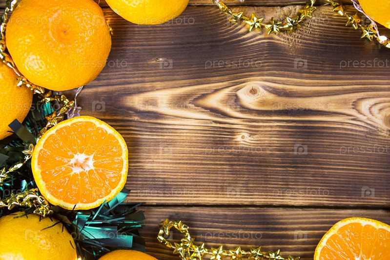 Новогодний праздничный фон из дерева с мандаринами, гирляндами и зеленой мишурой. Половинка апельсина, цитрусовый аромат праздника. Рождество, Новый год. Место для текста. Рамка