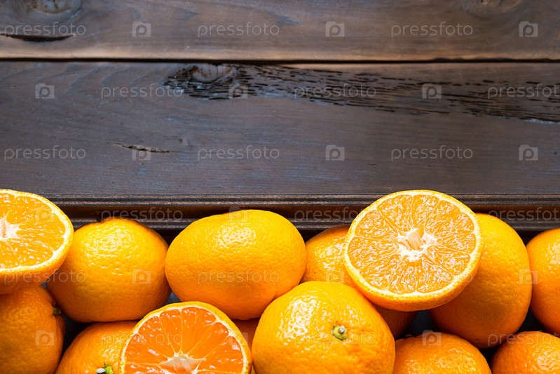 Свежие мандарины в коричневой коробке на деревянном фоне с зелеными еловыми ветками. Рамка, пространство для копирования, праздничный и зимний аромат, новый год, Рождество. Здоровое питание, апельсиновый сок, витрина. Нарезать и вырезать
