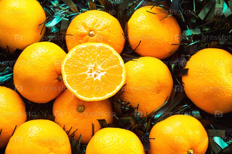 Свежие мандарины в гирляндах, на еловых ветках и мишуре - яркий новогодний фон. Половинка апельсина, цитрусовый аромат праздника. Рождество, Новый год. Место для текста