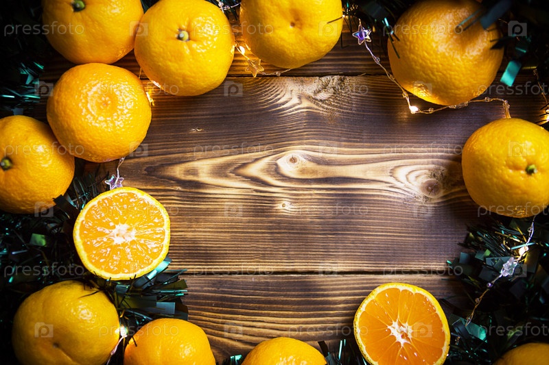 Новогодний праздничный фон из дерева с мандаринами, гирляндами и зеленой мишурой. Половинка апельсина, цитрусовый аромат праздника. Рождество, Новый год. Место для текста. Рамка