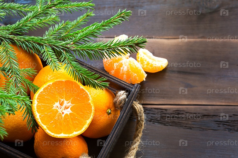 Свежие мандарины в коричневой коробке на деревянном фоне с зелеными еловыми ветками. Рамка, пространство для копирования, праздничный и зимний аромат, новый год, Рождество. Здоровое питание, апельсиновый сок, витрина. Нарезать и вырезать