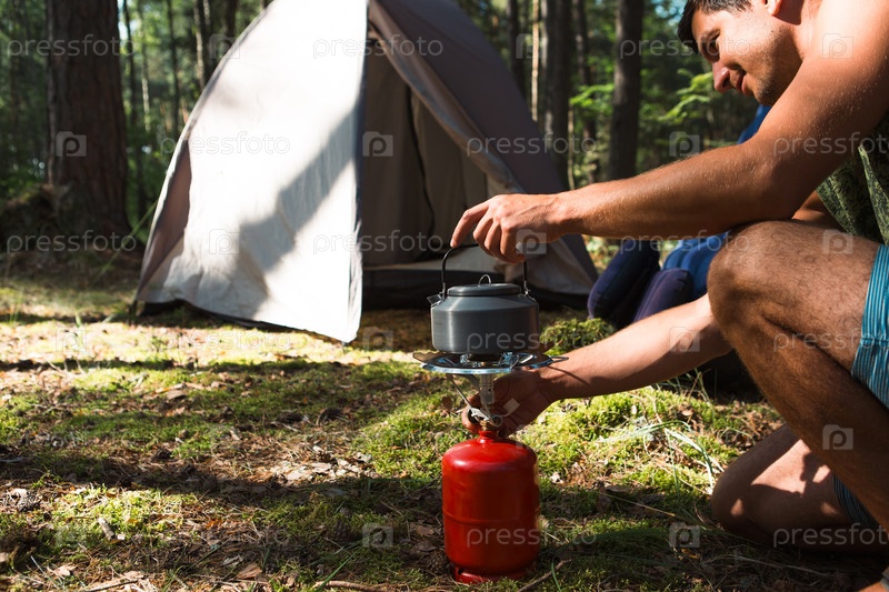 Готовим, топим туристический чайник на переносной газовой горелке красным газовым баллоном. Кемпинг, мужчина готовит завтрак на открытом воздухе. Летние мероприятия на свежем воздухе
