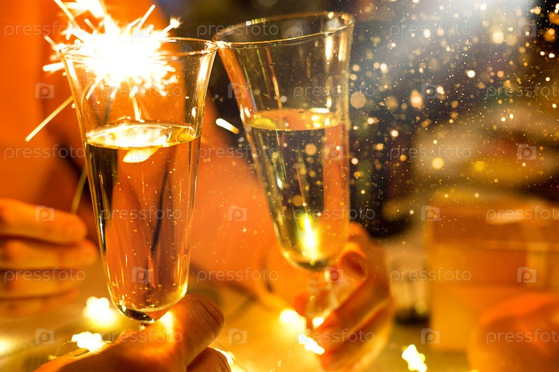 Бенгальские огни в бокале шампанского - прозрачный бокал с вином и брызгами. Новый год, праздничное настроение, праздник. Рождество