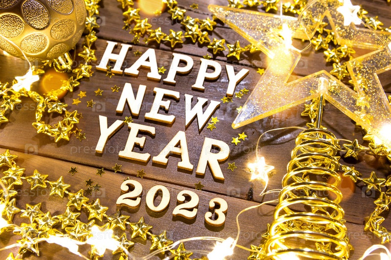 С Новым годом - деревянные буквы и цифры 2023 на праздничном фоне с блестками, звездами, блестками, огнями гирлянд. Привет, открытка. Календарь, обложка