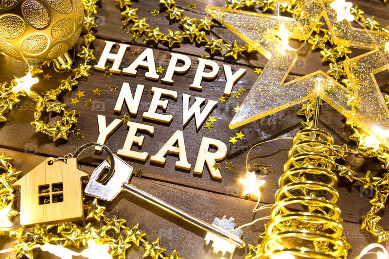 Ключ от дома с брелком на праздничном фоне с блестками, звездами, огнями гирлянд. С Новым годом - деревянные буквы, поздравления, открытки. Покупка, строительство, переезд, ипотека
