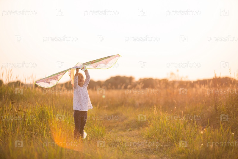 Девушка выбегает в поле с воздушным змеем, учится его запускать. Отдых на свежем воздухе летом, природа и свежий воздух. Детство, свобода и беззаботность. Ребенок с крыльями — это мечта и надежда