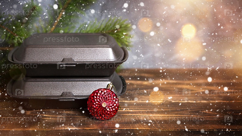 Рождественский декор контейнеров службы доставки еды и коробки для пиццы. Предновогодняя акция. Готовый горячий заказ, одноразовая пластиковая и бумажная упаковка. Работа по организации питания в праздничные дни. Копипространство