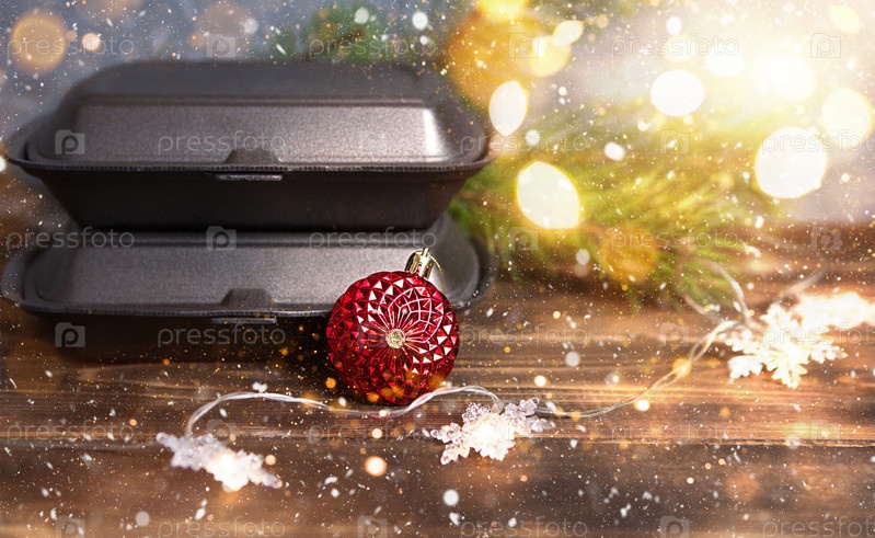 Рождественский декор контейнеров службы доставки еды и коробки для пиццы. Предновогодняя акция. Готовый горячий заказ, одноразовая пластиковая и бумажная упаковка. Работа по организации питания в праздничные дни. Копипространство