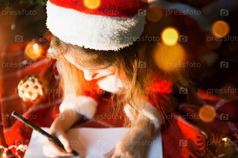 Маленькая девочка в шапке Санты и красном платье под елкой мечтает, ждет праздника, лежа на пледе. Письмо на листе бумаги, подарки. Новый год, Рождество. расфокусированные огни