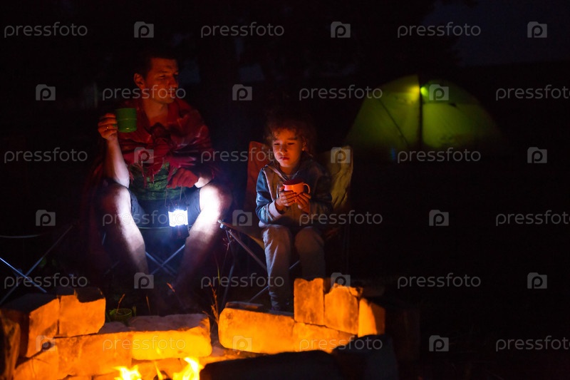 Папа и дочь сидят ночью у костра на открытом воздухе летом на природе. Семейный поход, посиделки у костра. День отца, барбекю. Кемпинговый фонарь и палатка