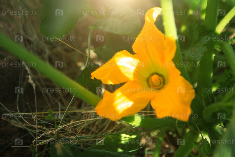Большой желтый цветок цуккини в саду. Цветение овощных культур, выращивание огурца, тыквы в саду. Рассада, уход за растениями, удобрения и защита от вредителей
