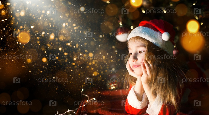 Маленькая девочка в шапке Санты и красном платье под елкой мечтает, ждет праздника, лежа на пледе. Письмо на листе бумаги, подарки. Новый год, Рождество. расфокусированные огни