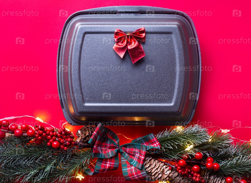 Рождественский декор контейнеров службы доставки еды. Предновогодняя акция. Готовый горячий заказ, одноразовая пластиковая и бумажная упаковка. Работа по организации питания в праздничные дни. Скопируйте пространство, макет