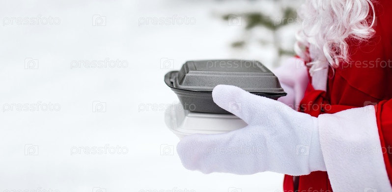 Контейнеры службы доставки еды в руках Санта-Клауса на открытом воздухе в снегу. Акция в канун Рождества. Готовый горячий заказ, одноразовая пластиковая коробка. Питание новогодних праздников. Скопируйте пространство, макет