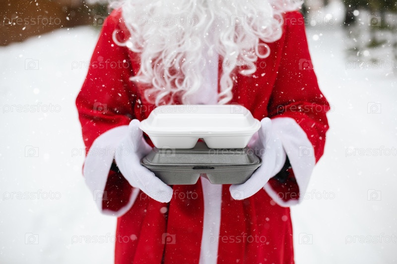 Контейнеры службы доставки еды в руках Санта-Клауса на открытом воздухе в снегу. Акция в канун Рождества. Готовый горячий заказ, одноразовая пластиковая коробка. Питание новогодних праздников. Скопируйте пространство, макет