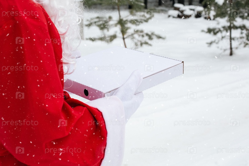 Белая коробка из-под пиццы в руках у Деда Мороза в белых варежках, с бородой, в красном пальто. Рождественская доставка фаст-фуда. Предновогодняя акция. Работа по организации питания в праздничные дни. Скопируйте пространство, макет