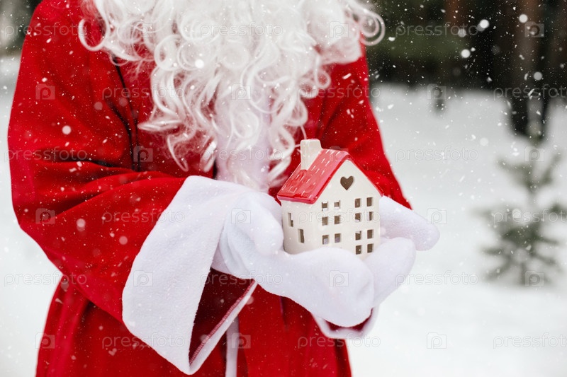 Дом, миниатюрный коттедж в руках Санта-Клауса на открытом воздухе в снегу. Сделки с недвижимостью, покупка, строительство, переезд, ипотека. Уютный дом, Доставка подарков. Счастливого Рождества, бронирование нового года