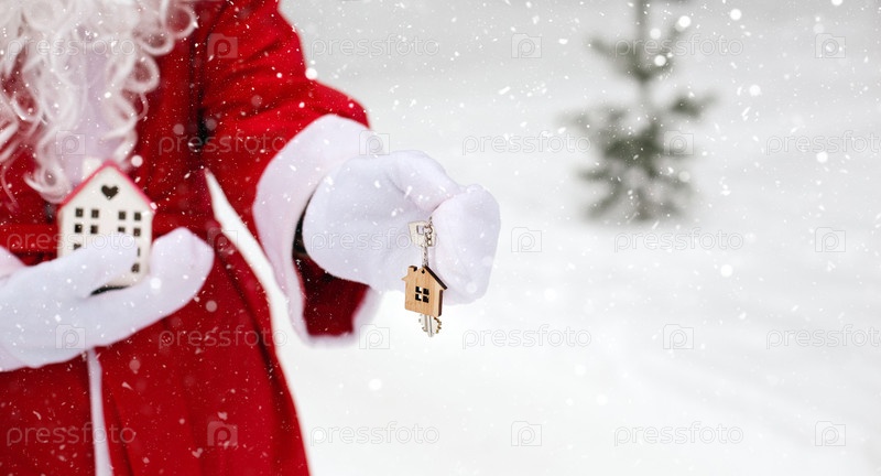 Ключ от дома с брелком в руках Санта-Клауса на открытом воздухе в снегу. Сделки с недвижимостью, покупка, строительство, переезд, ипотека. Уютный дом. С Рождеством, новогодним бронированием и залом