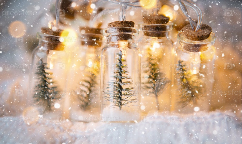 Сказочные огни в банке с рождественской елкой и снегом крупным планом в теплом уютном настроении с золотой гирляндой. Рождество и Новый год, праздничный декор, пространство для копирования. Рождественский фон