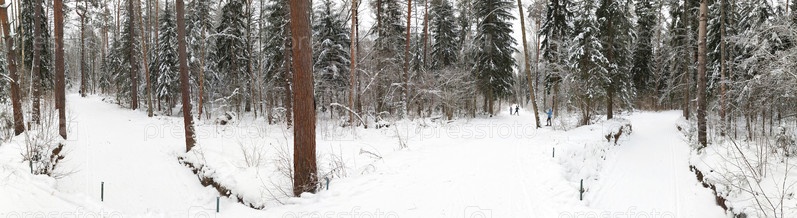 Панорама зимнего хвойного леса с беговой лыжней и лыжниками, поднимающимися в гору. Зимние активные виды спорта на свежем воздухе, прогулки, здоровый образ жизни