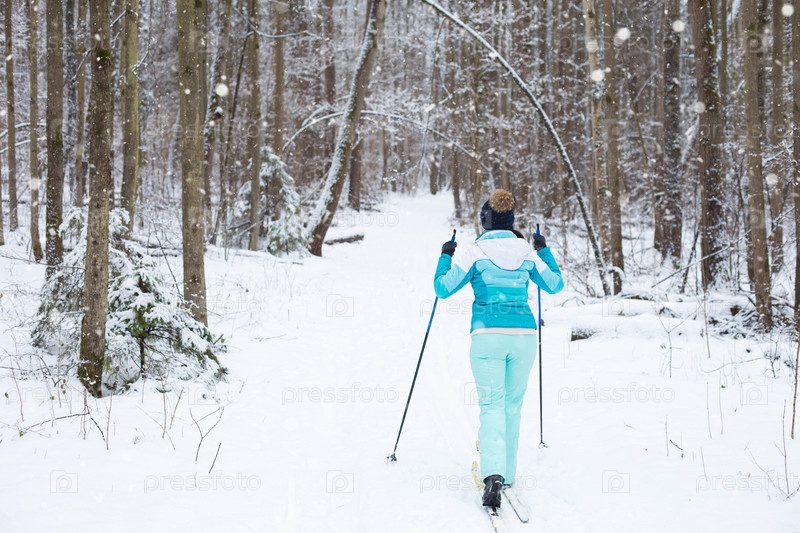 Лыжник в ветровке и шляпе с помпоном с лыжными палками в руках спиной на фоне заснеженного леса. Беговые лыжи в зимнем лесу, спорт на открытом воздухе, здоровый образ жизни