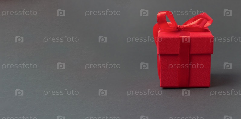 Красная подарочная коробка, перевязанная лентами с бантами на сером фоне