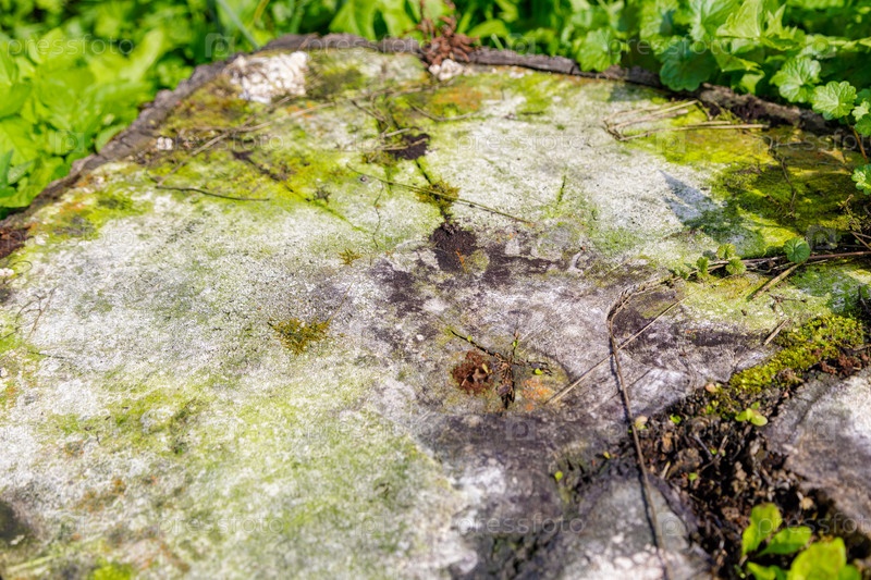 Гнилой срез дерева, покрытый грибком и плесенью на поляне. Концепция вырубки гнилых деревьев. Крупный план