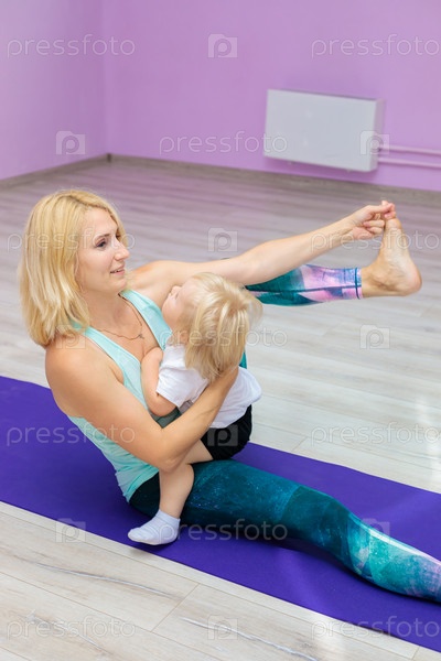 Мама и ребенок занимаются йогой в зале. Концепция современной женщины процветает повсюду. Малыш отвлекает маму