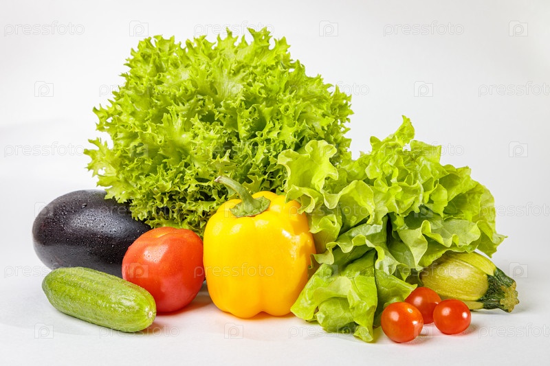 Набор свежих сырых овощей на белом фоне. Салат, помидоры, огурцы, баклажаны, кабачки
