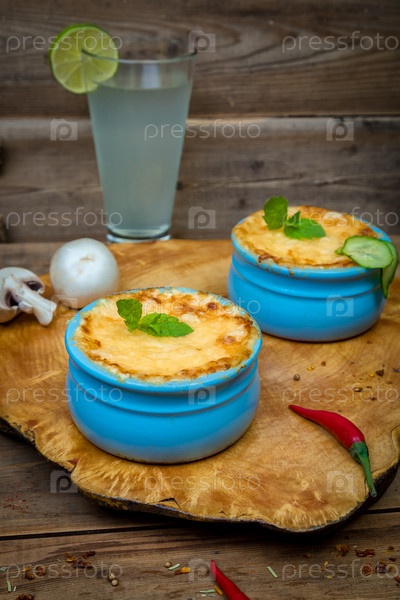 Горшки с жульеном из грибов на деревянной доске