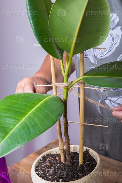 Женщина привязывает веревкой к цветку фикуса опору. Цветоводство. Крупный план