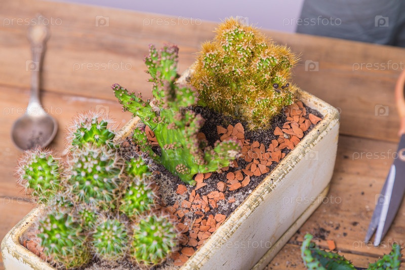 Женщина пересаживает цветок кактуса в небольшой фигурный горшок. Цветоводство, крупный план