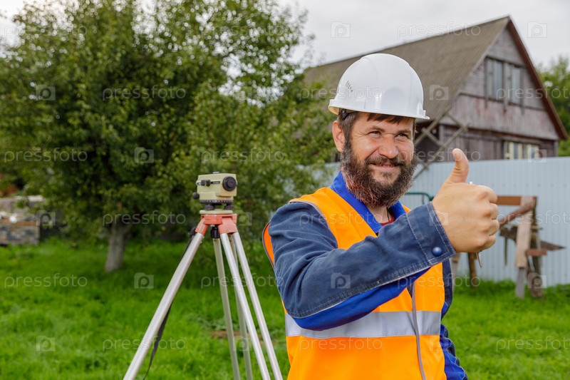 Инженер-строитель с оптическим уровнем с улыбкой одобряет работу своих коллег, поднимая руку