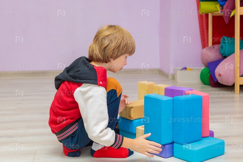 В зале ребенок собирает кубики-игрушки. Мальчик играет в зале со спортивными предметами