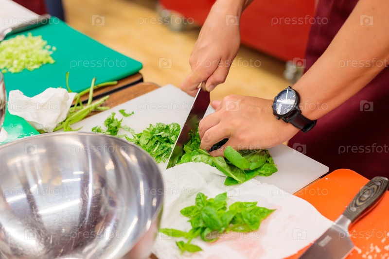 Мужские руки режут зелень, чтобы приготовить ужин. Нарежьте петрушку кухонным ножом на доске