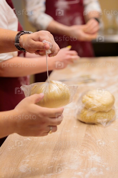 Руки нескольких человек месят тесто на столе. Смешайте сырое яйцо с мукой. Крупный план