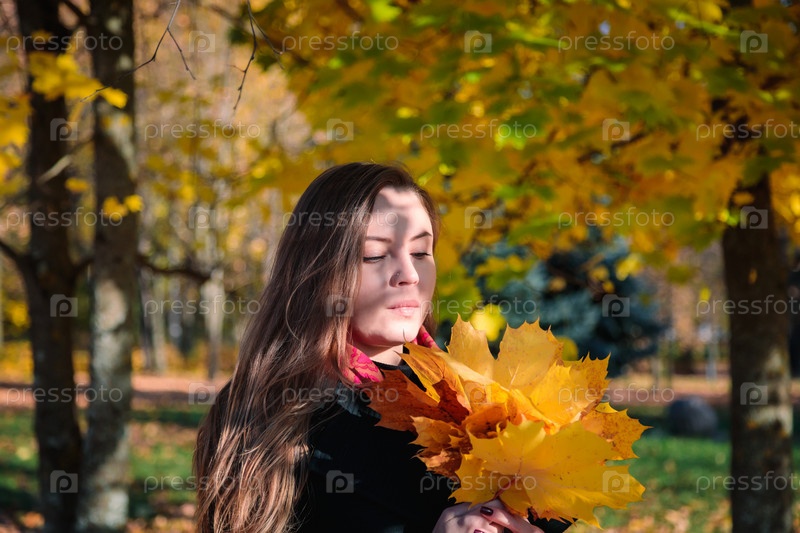 Женщина с длинными волосами смотрит на желтые листья в осеннем парке. Осенний сезон