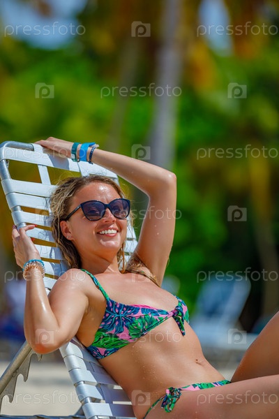 Молодая девушка в купальнике загорает на шезлонге. Счастливый, смеющийся. Фото высокого качества