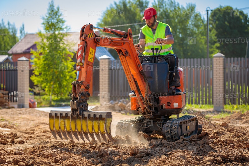 Мужчина на мини-экскаваторе разравнивает участок земли, рыхлит почву