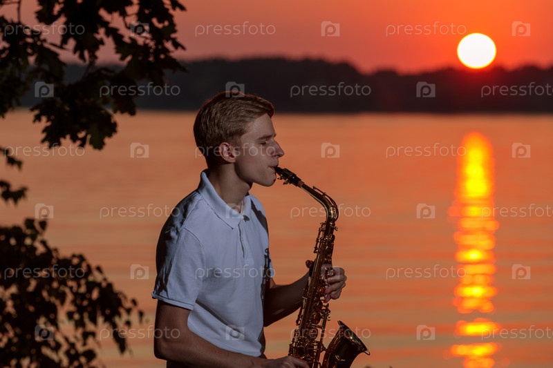 Молодой парень играет на саксофоне вечером на закате