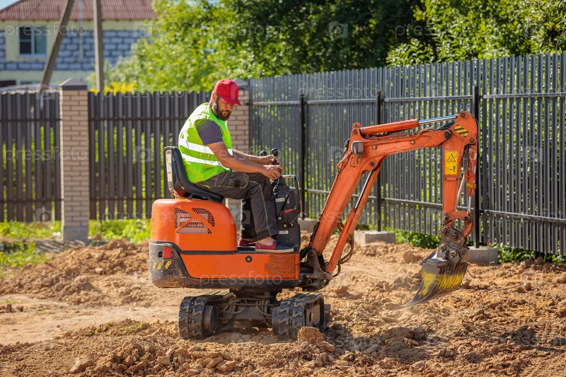 Мужчина на мини-экскаваторе разравнивает участок земли, рыхлит почву