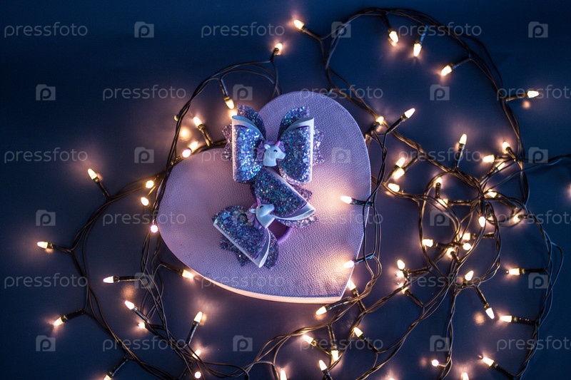 Упакованный новогодний подарок на фоне включенной гирлянды крупным планом