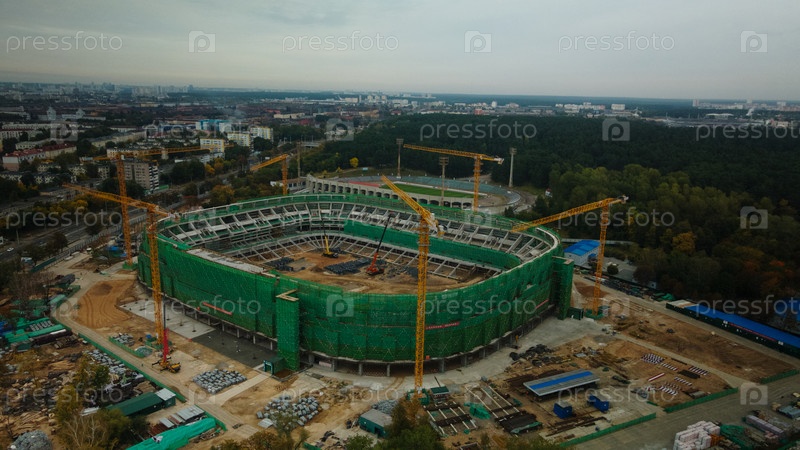 Строительство стадиона в большом городе. Строительная площадка среди городских районов. Аэрофотосъемка
