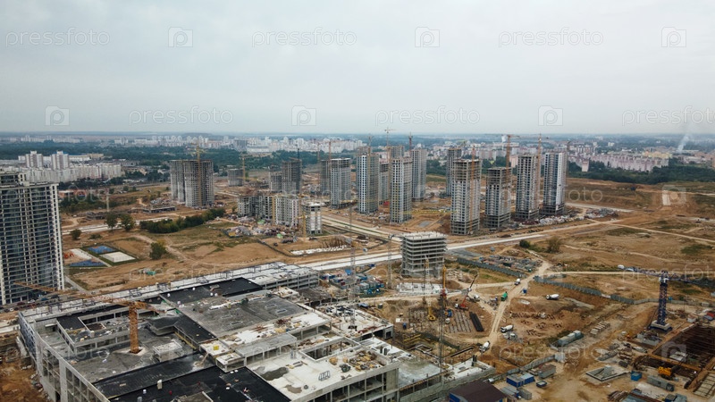 Строительная площадка нового городского квартала. Строительство многоэтажных домов. Пасмурная погода. Аэрофотосъемка