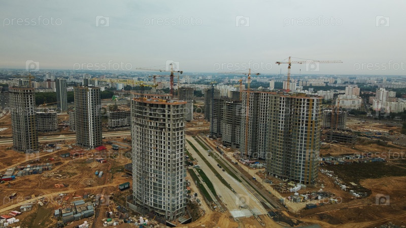 Строительная площадка нового городского квартала. Строительство многоэтажных домов. Пасмурная погода. Аэрофотосъемка