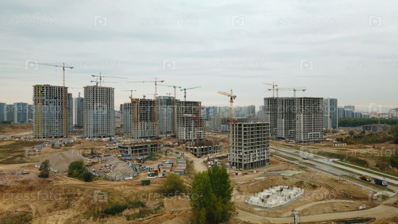 Строительная площадка нового городского квартала. Строительство многоэтажных домов. Пасмурная погода. Аэрофотосъемка