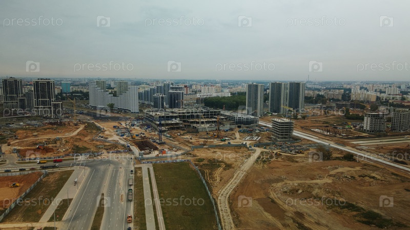 Строительная площадка нового городского квартала. Строительство многоэтажных домов. Пасмурная погода. Аэрофотосъемка