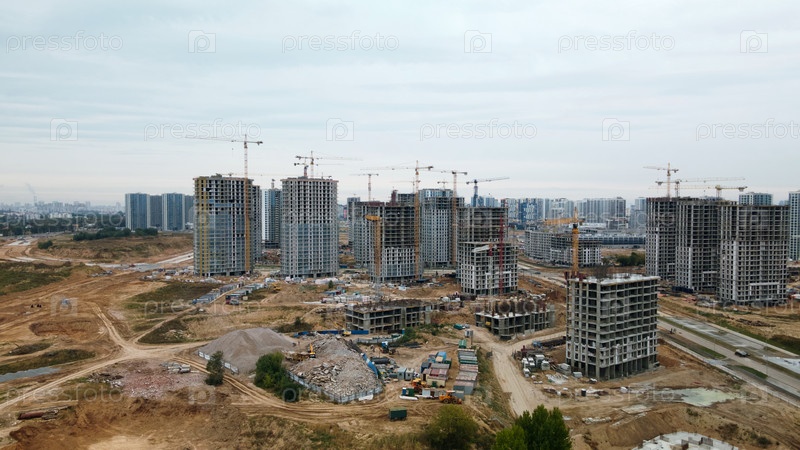 Строительная площадка нового городского квартала. Строительство многоэтажных домов. Пасмурная погода. Аэрофотосъемка