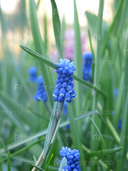 Голубые цветы мускари (мышиный гиацинт) распускаются весной на клумбе