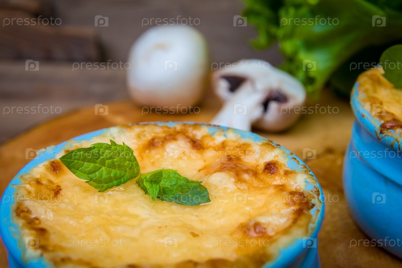 Горшочек с грибным жульеном на деревянной доске, украшенный зеленью